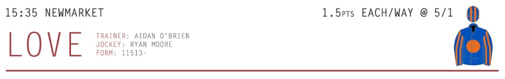Love made her final start of the season in the Group 1 Fillies’ Mile at Newmarket in October. Starting off in midfield, Love moved forward to join the leaders at the halfway stage. The field got racing a long way from home that day however, as Boomer made a move at the 3f pole, with Powerful Breeze then also moving on quickly to lead with a furlong and a half left to run. This injection of pace really gave Quadrilateral something to aim at as she stayed on strongly to just get up, but Love also ran on well – finishing 1¾ lengths back in third. Once more the good to soft ground at Newmarket wouldn’t have been in Love’s favour, but she still ran a cracker to finish so close in third on her first try at a mile. Returning to much quicker ground at Newmarket on Sunday, Love is a perfect type of Filly to progress past her rivals this season. Aidan O’Brien often sends his best Filly to the 1000 Guineas fresh so that wouldn’t be a concern, and he recently said that they always thought Love would make up into a better three-year-old.
